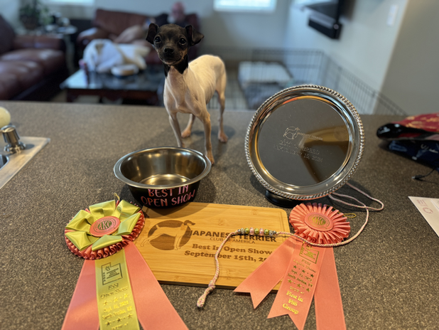 Born in November 2023, Kisa has been a spitfire from the moment she came home. She is small in size at just 6 pounds, but she is all terrier in spirit. Always on the move, Kisa brings a spark of high energy and determination to everything she does. She was the first Japanese Terrier in history to earn a Best in Open Show, an incredible accomplishment achieved during her very first cluster of shows. Kisa is currently working toward her AKC Certificate of Merit (CM) and continues to impress with her potential.